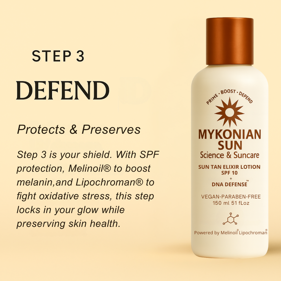 At Mykonian Sun, we combine advanced antioxidants with our exclusive DNA Defense™ technology to strengthen skin at the cellular level. This innovation supports natural tanning, protects collagen, and helps repair UV-induced damage before it becomes visible.
